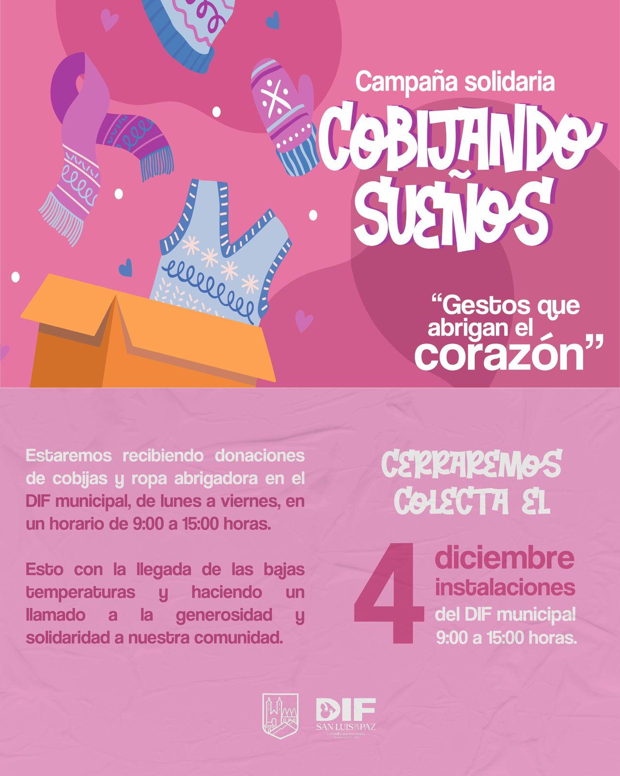 Puedes donar cobijas y ropa en buen estado que ya no uses, para darles una nueva vida y que lleguen a quienes más lo necesitan. Las donaciones se reciben en el DIF Municipal, de san sluis de la paz, de 9:00 a.m. a 3:00 p.m.