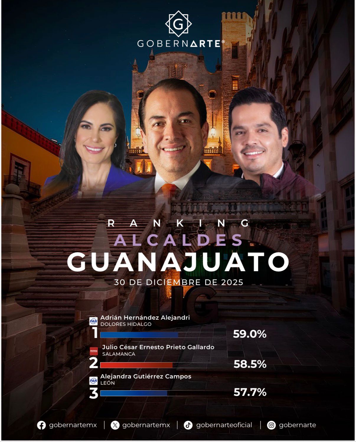 De acuerdo a las recientes consultas, el Gobierno Municipal de Dolores Hidalgo Cuna de la Independencia Nacional con el liderazgo del presidente municipal, Adrián Hernández Alejandri, cierra el 2025 por tercer mes consecutivo con la mayor calificación ciudadana a nivel estatal.