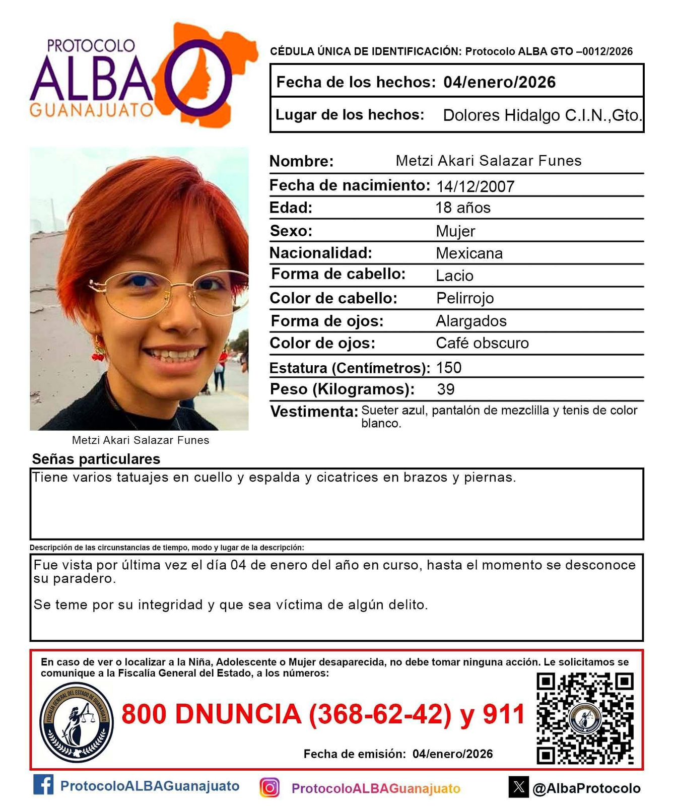 La joven Metsi Acari Salazar Fuentes, de 18 años de edad, fue localizada sana y salva, gracias al apoyo de la ciudadanía y la activación del Protocolo Alba.